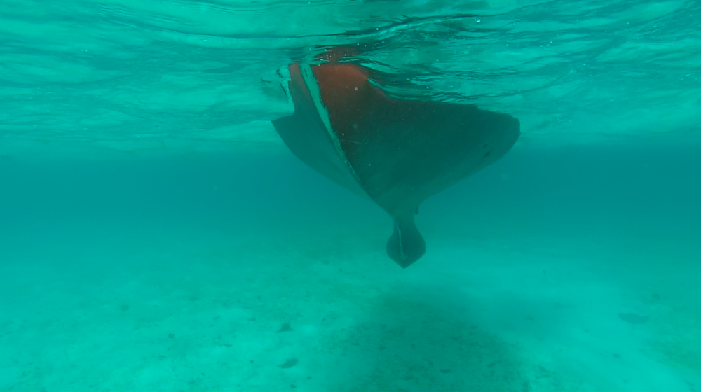 Cati war schon ganz betrübt, als wir gegen 16 Uhr zurück an Bord gefahren sind. Plötzlich höre ich ein fiependes Geräusch aus dem Cockpit. Was ist das? Wale? Ultraschall? Ich klettere an Deck und sehe Cati mit großen Augen und ausgestrecktem Zeigefinger im Cockpit stehen. „Fieep. Fieep!“ Sie will jauchzen vor Glück, aber bekommt keinen Ton raus, nur das fiepen. Ich folge ihrem Finger – und da paddelt doch gerade eine große Schildkröte in fünf Meter Entfernung an „Maverick“ vorbei. „Rein ins Wasser“, rufe ich. Cati will mir nicht glauben. „Ich kann doch nicht mit der Schildkröte schnorcheln“, sagt sie. „Na klar. Schnell, sonst ist sie weg!“. Also hüpfen wir ins Wasser und paddelt mit der Schildkröte um die Wette. Sie hat einen Durchmesser von gut 80 Zentimetern und schwebt ganz knapp über dem Grund, reisst sich ab und zu ein Grasbüschel vom Meeresgrund ab.