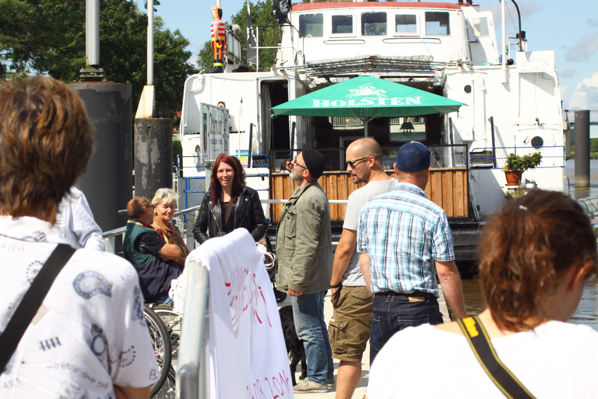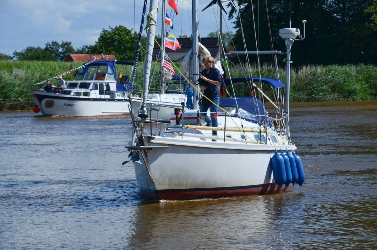 Die ganze Ankunft war schon ziemlich kribbelig, denn wir wussten ja gar nicht, was uns überhaupt erwartet. Wir hatten auf unserer Internetseite und bei facebook eingeladen, aber wer weiß schon, ob sich jemand auf den Weg nach Oberdorf machen möchte. Die erste Überraschung wartete schon an der Ostemündung auf uns. Nach und nach gesellte sich ein richtiger Konvoi zu uns, im Funkgerät konnten wir mitverfolgen, wie nach uns Ausschau gehalten wurde. Flaggen, Tröten und viel Gewinke, sogar das Fahrgastschiff Mocambo hat uns willkommen geheißen. Damit haben wir nun wirklich überhaupt nicht gerechnet.