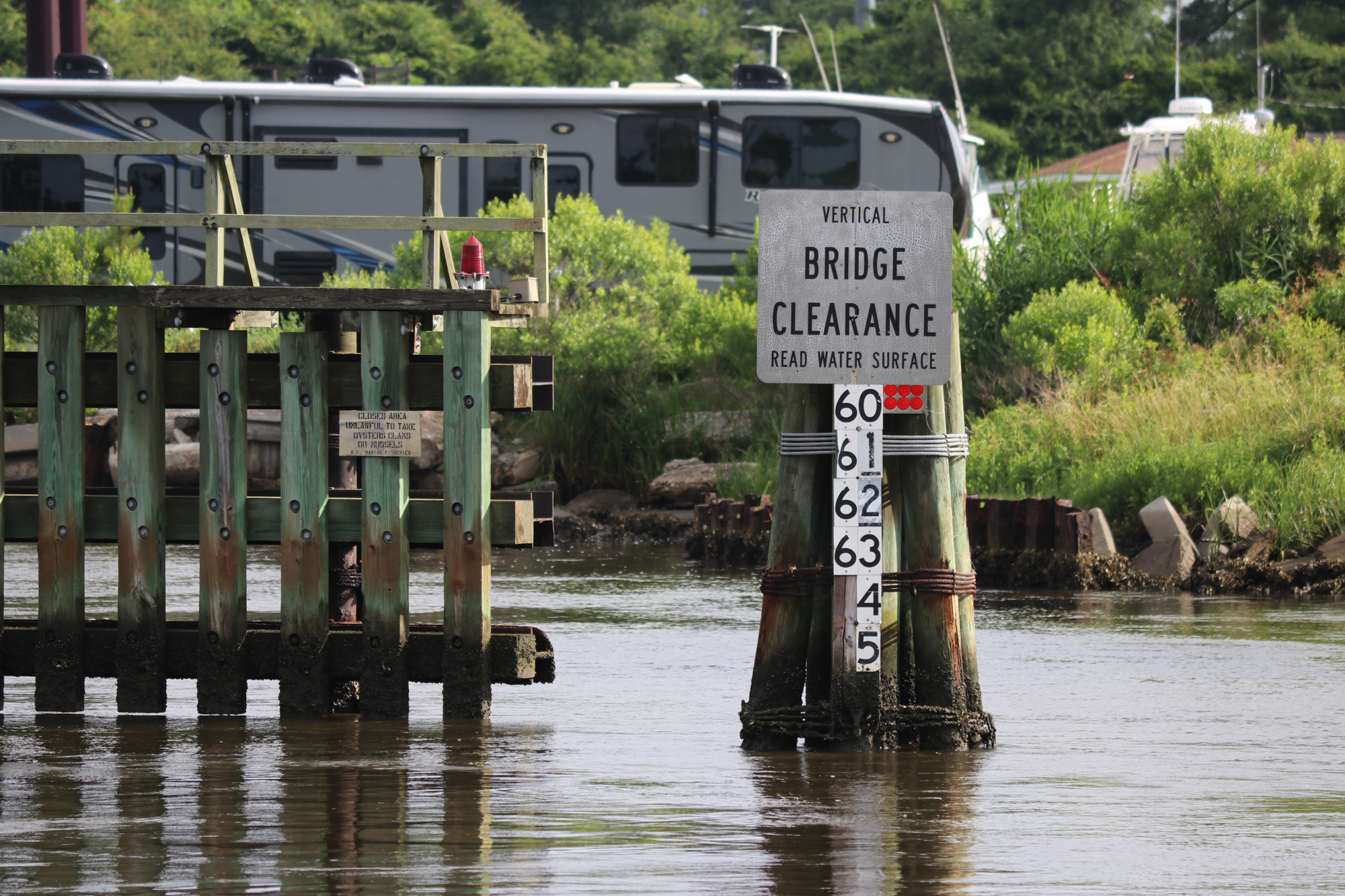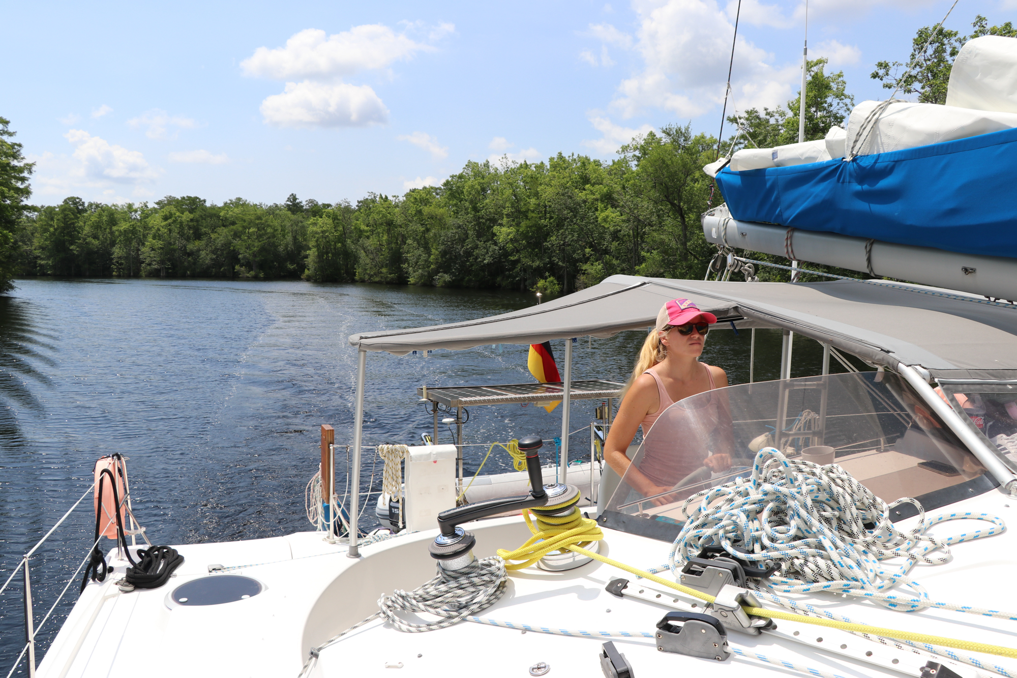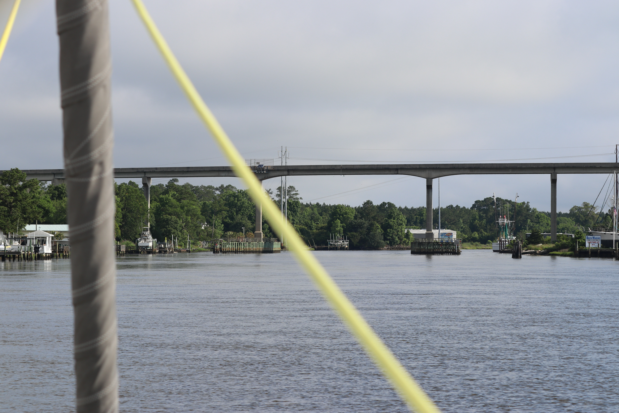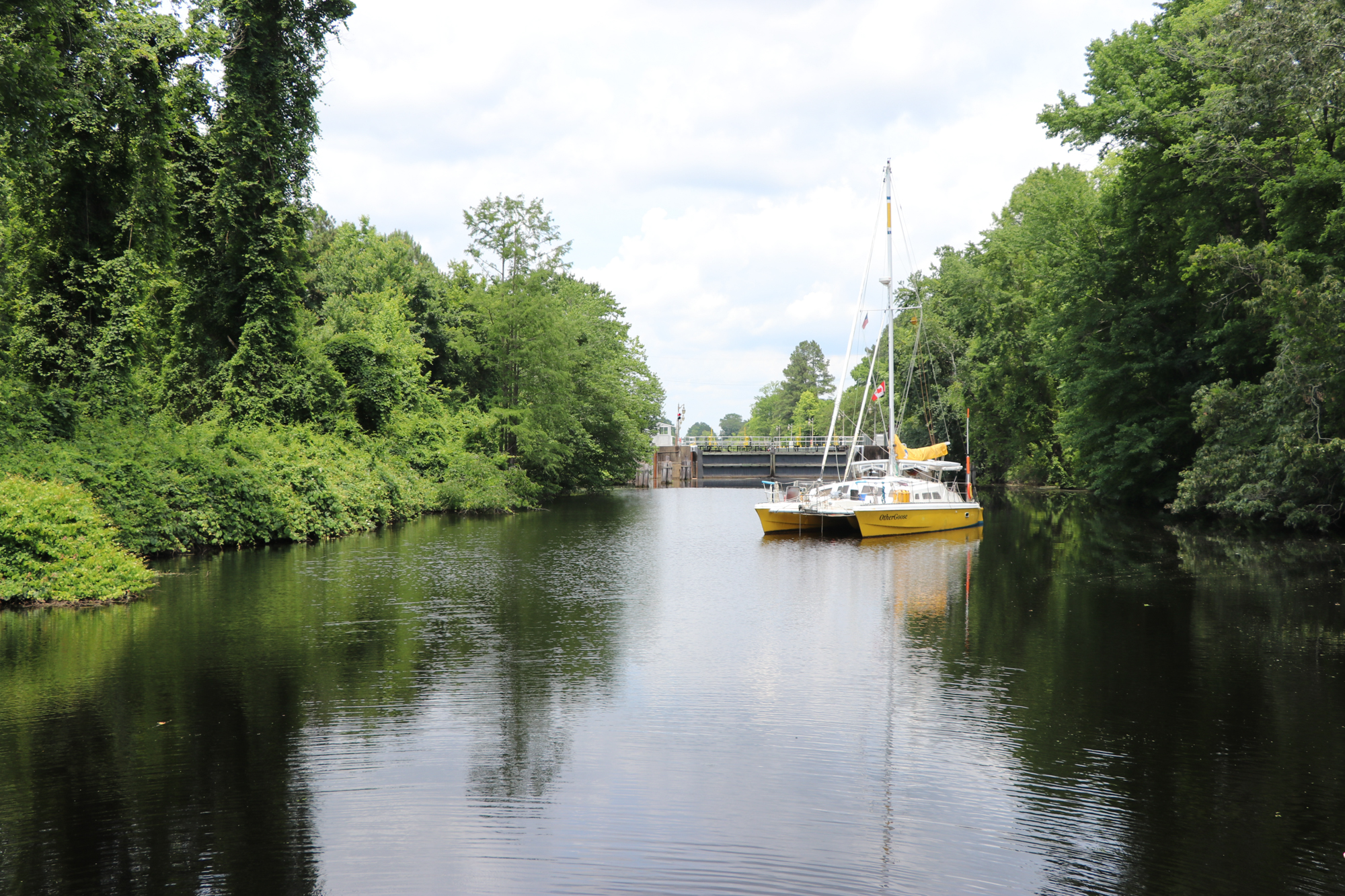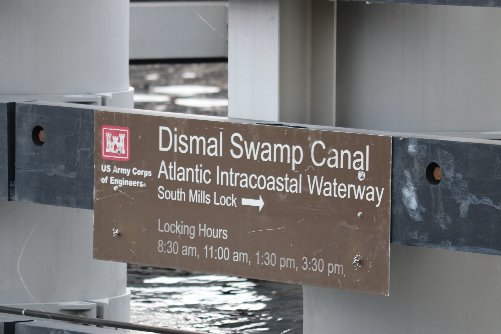 Die Binnentour hat also den Vorteil, dass man ab und zu mal nachts irgendwo in einem Creek Schutz finden könnte … Aber sie hat auch einen Nachteil für uns: Feste Brücken, die die einzelnen Inseln, Halbinseln und die Outer Banks mit dem Festland verbinden. O “Fixed Bridges” in den USA haben alle eine Höhe von 65 Pé (19,5 Metro). Unser Mast ist 64,5 Pé (19,35 Metro) hoch. Plus die beiden UKW-Antennen (sobre 3 Pé / 0,90 Metro). Das heißt: Die Brücken sind irre knapp. Meist versuchen wir, wo es geht, die Brücken bei Niedrigwasser zu passieren, um noch ein bisschen mehr Luft zu haben. Doch während Niedrigwasser in Beaufort noch mehr als einen halben Meter mehr Höhe bedeutet, ist der Gezeitenunterschied weiter im Binnenland kaum noch zu merken. Vor allem nicht im Dismal Swamp Kanal, der Elizabeth City und den Albemarle Sound mit Norfolk und der Chesapeake Bay verbindet. Er ist einer der ältesten noch befahrbaren Kanäle der USA und führt mitten durch die Wildnis. Auf beiden Seiten sitzt eine Schleuse. Deshalb ist der Wasserstand immer vom Regen und Sonne abhängig. Wenn es lange nicht regnet und die Sonne scheint, verdunstet Wasser und die Brücke hat mehr lichte Höhe.
