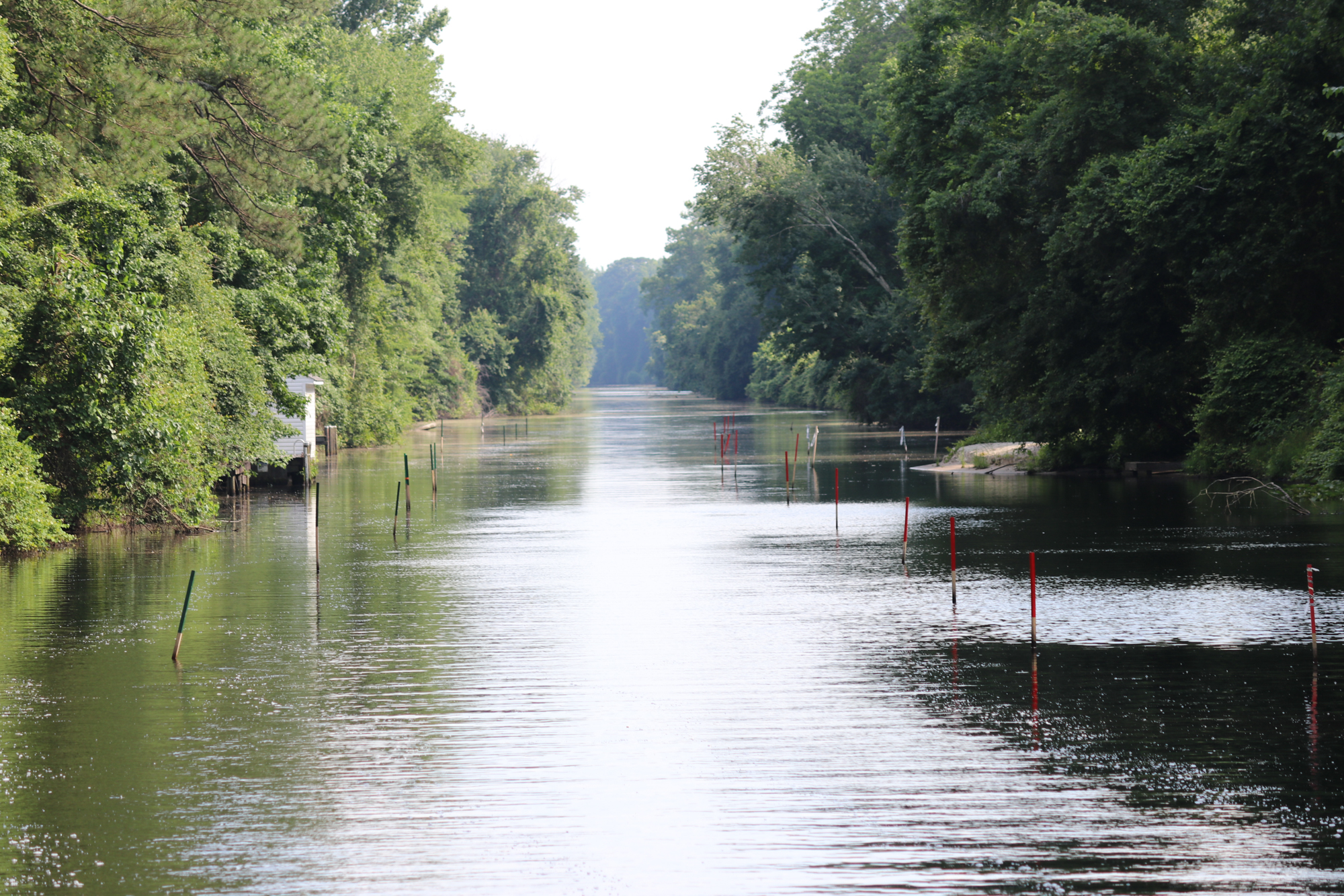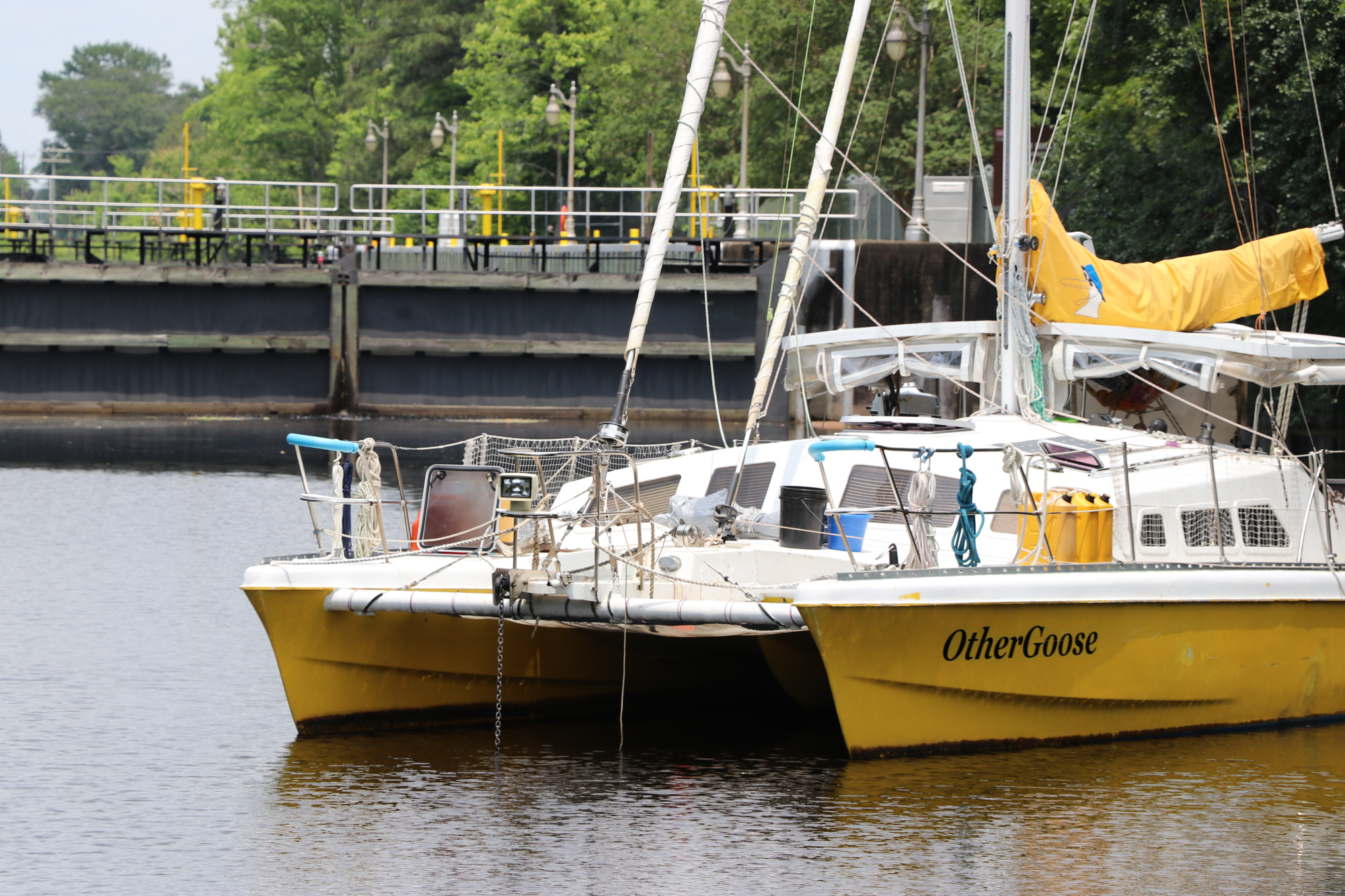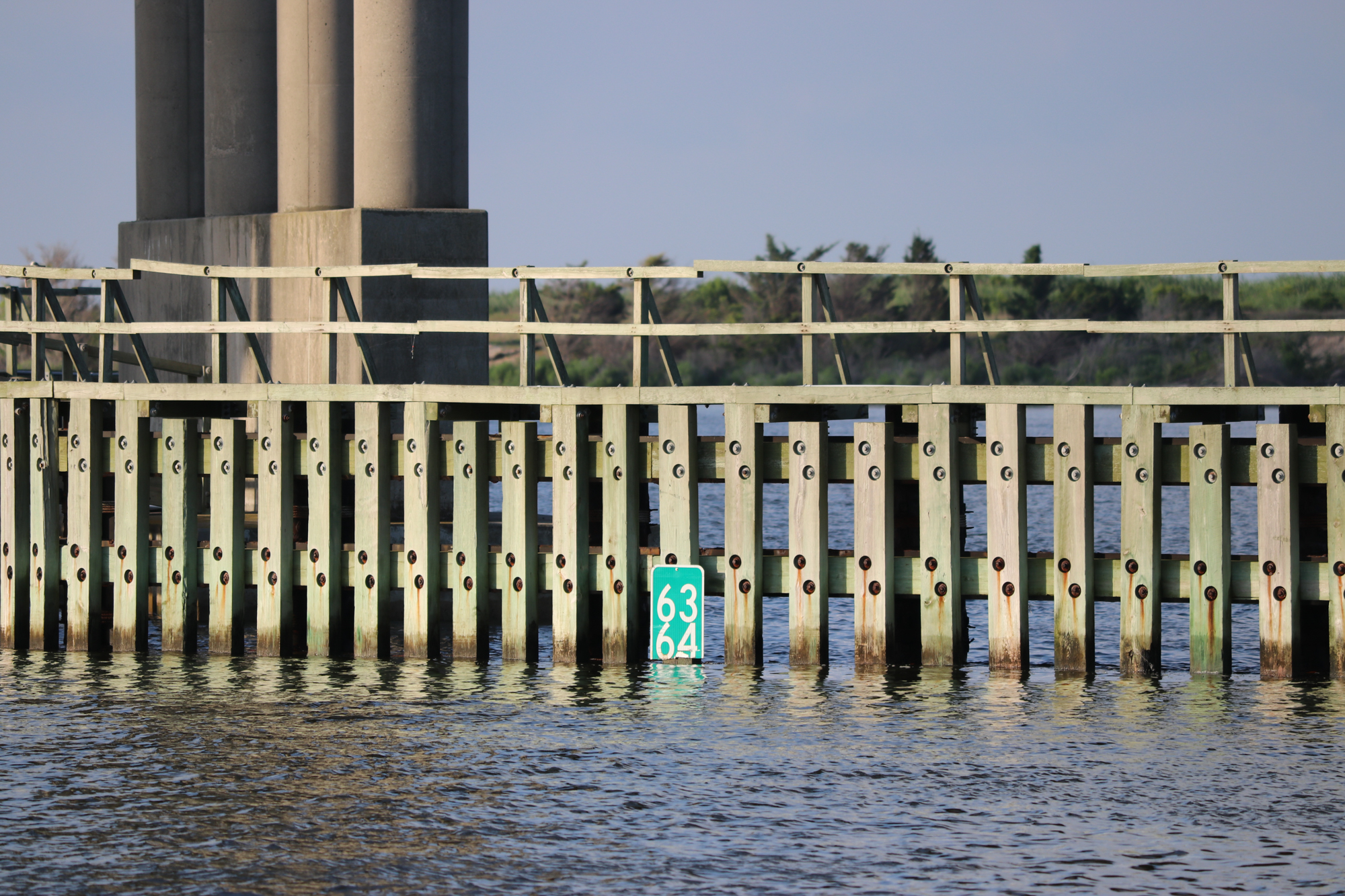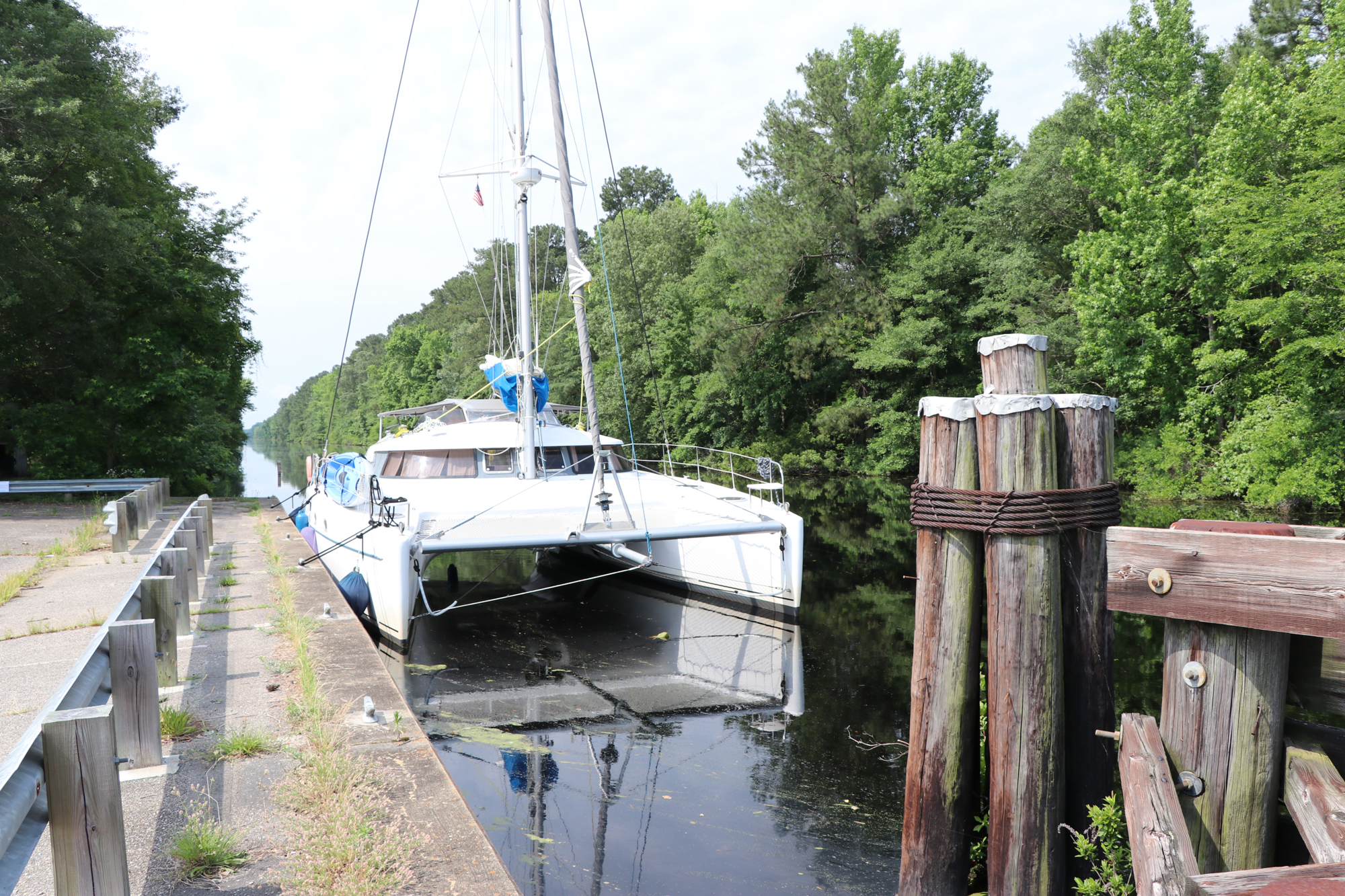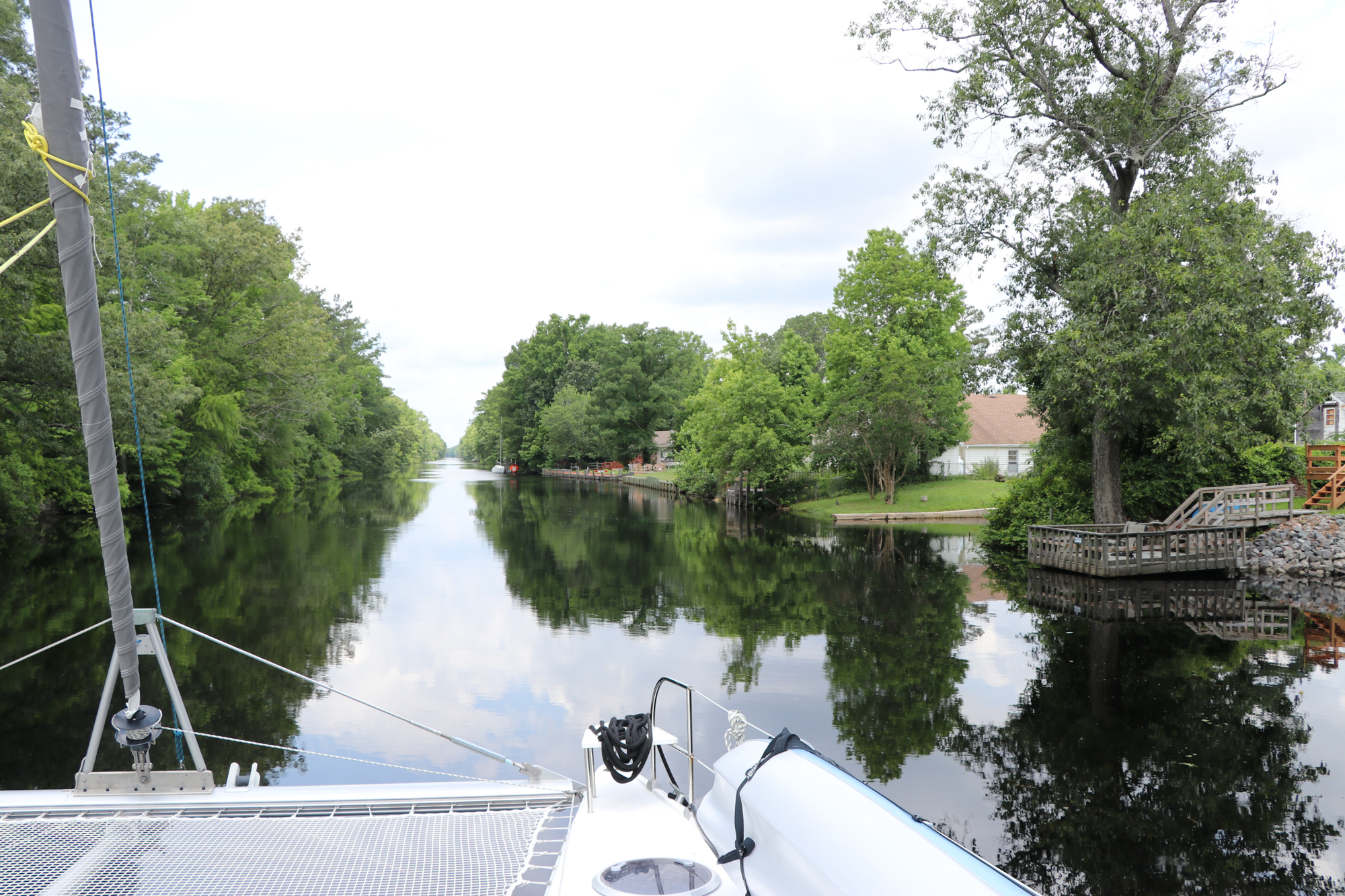 Die Binnentour hat also den Vorteil, dass man ab und zu mal nachts irgendwo in einem Creek Schutz finden könnte … Aber sie hat auch einen Nachteil für uns: Feste Brücken, die die einzelnen Inseln, Halbinseln und die Outer Banks mit dem Festland verbinden. O “Fixed Bridges” in den USA haben alle eine Höhe von 65 Pé (19,5 Metro). Unser Mast ist 64,5 Pé (19,35 Metro) hoch. Plus die beiden UKW-Antennen (sobre 3 Pé / 0,90 Metro). Das heißt: Die Brücken sind irre knapp. Meist versuchen wir, wo es geht, die Brücken bei Niedrigwasser zu passieren, um noch ein bisschen mehr Luft zu haben. Doch während Niedrigwasser in Beaufort noch mehr als einen halben Meter mehr Höhe bedeutet, ist der Gezeitenunterschied weiter im Binnenland kaum noch zu merken. Vor allem nicht im Dismal Swamp Kanal, der Elizabeth City und den Albemarle Sound mit Norfolk und der Chesapeake Bay verbindet. Er ist einer der ältesten noch befahrbaren Kanäle der USA und führt mitten durch die Wildnis. Auf beiden Seiten sitzt eine Schleuse. Deshalb ist der Wasserstand immer vom Regen und Sonne abhängig. Wenn es lange nicht regnet und die Sonne scheint, verdunstet Wasser und die Brücke hat mehr lichte Höhe.