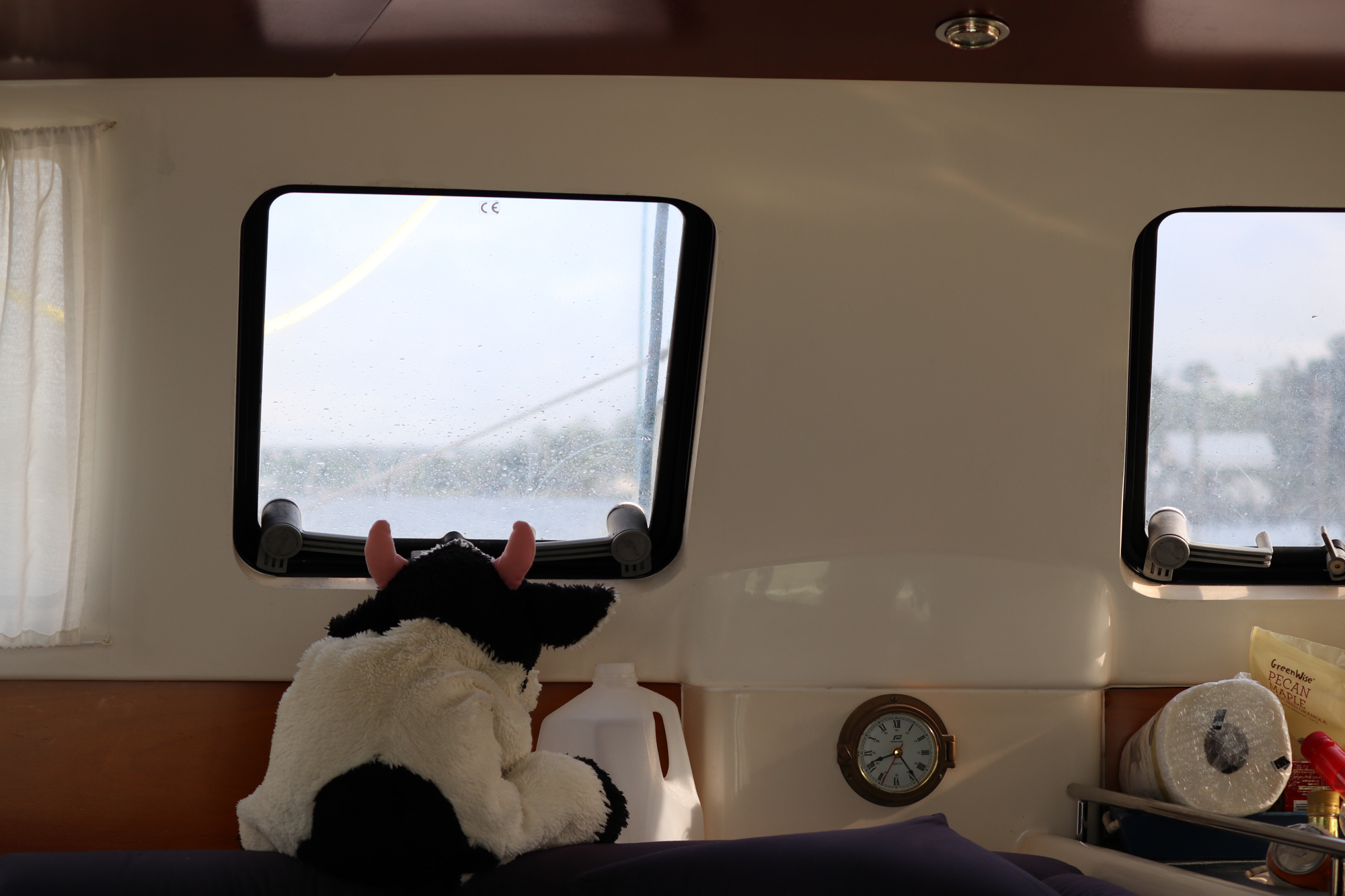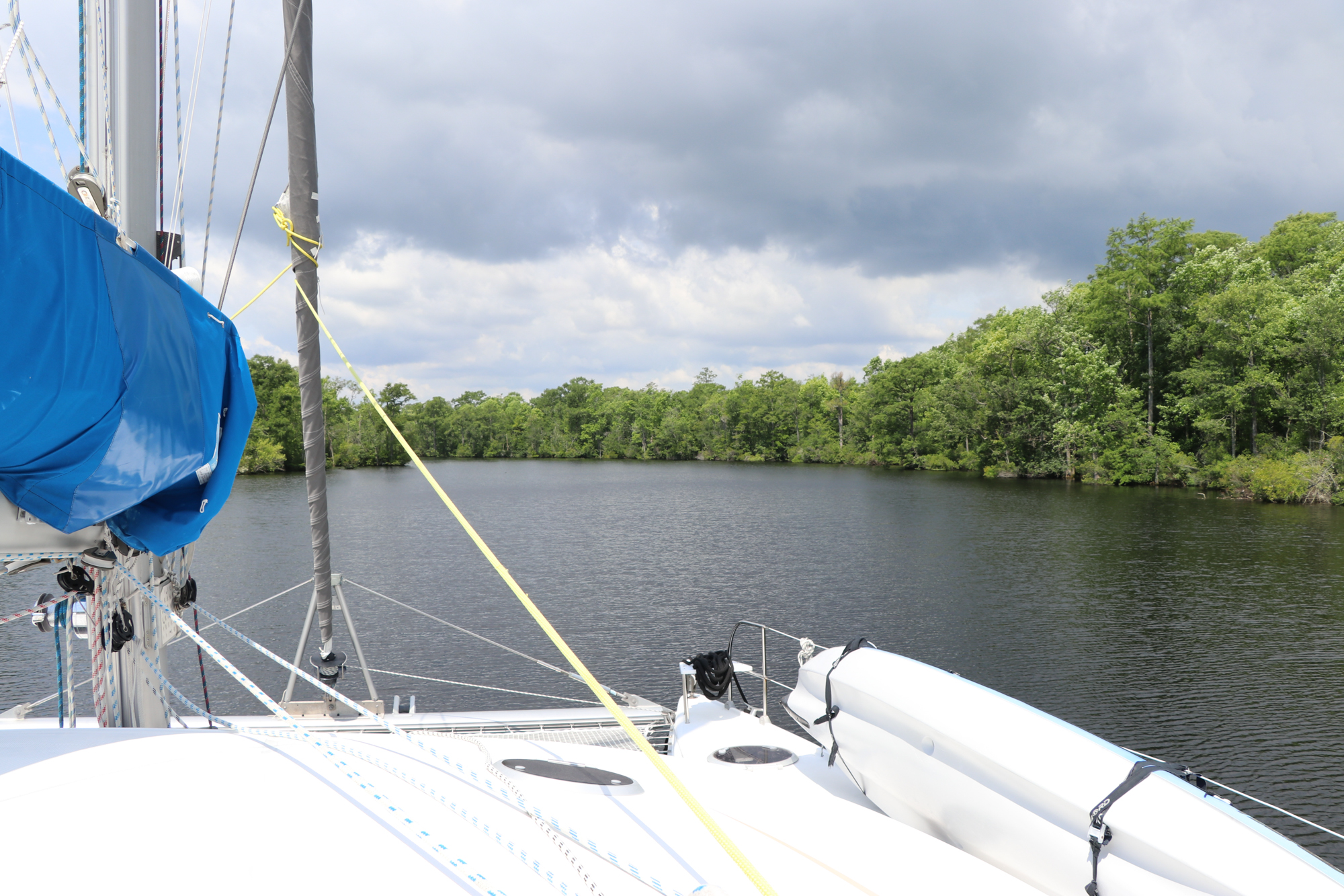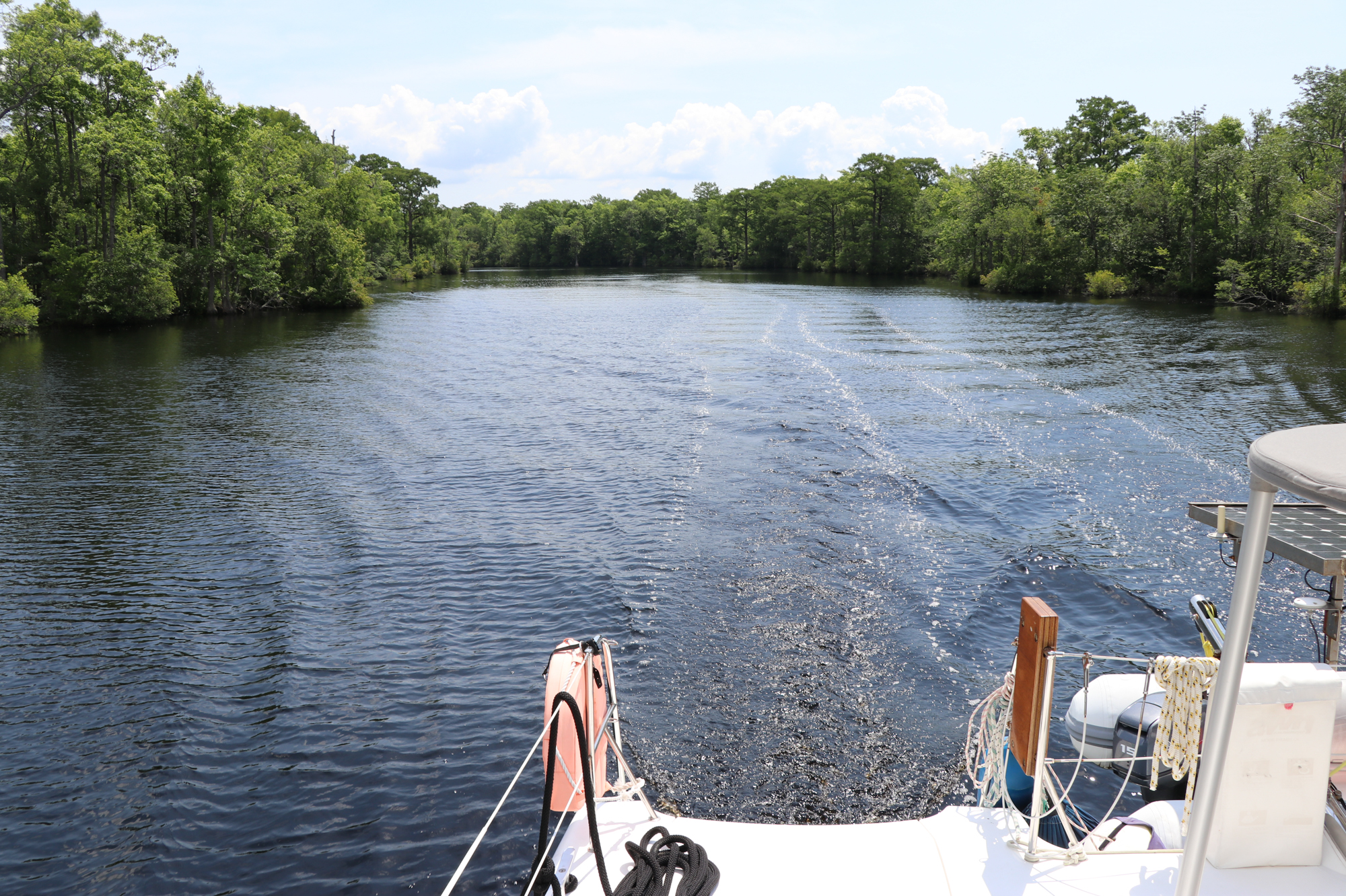Eine Binnenroute, eigentlich. Eigentlich aber auch nur bedingt, denn der große “See” zwischen Beaufort und Cape Hatteras misst gut 80 Seemeilen bei 30 Meilen Breite. Doch die Wellen sind weniger konfus als draußen vor dem Cape Hatteras, an dem Golfstrom (von Südwesten kommend) und Labradorstrom (von Norden kommend) aufeinandertreffen. Wenn dann auch noch ein Gewitter mitspielt (und das passiert gerade eigentlich jede Nacht …), dann kann es dort durch zwei verschiedene Stromrichtungen und womöglich eine dritte Komponente (Wind) ziemlich ungemütlich werden.